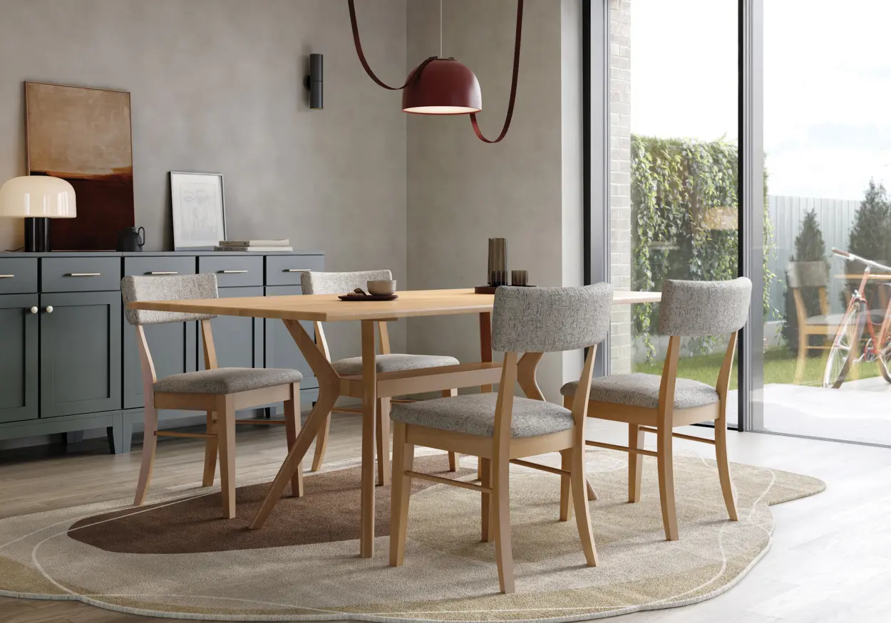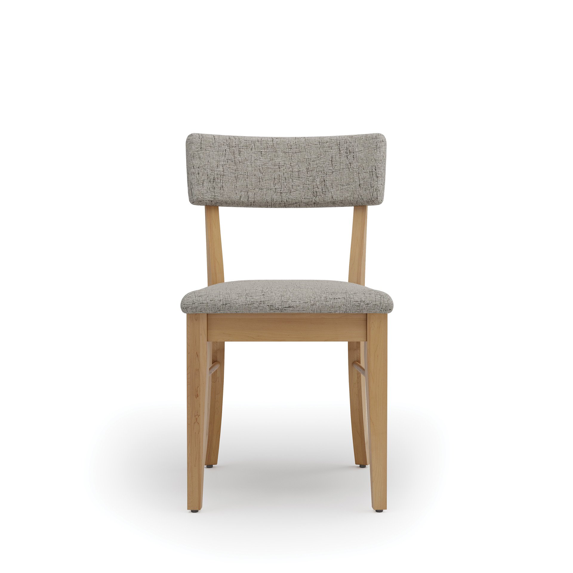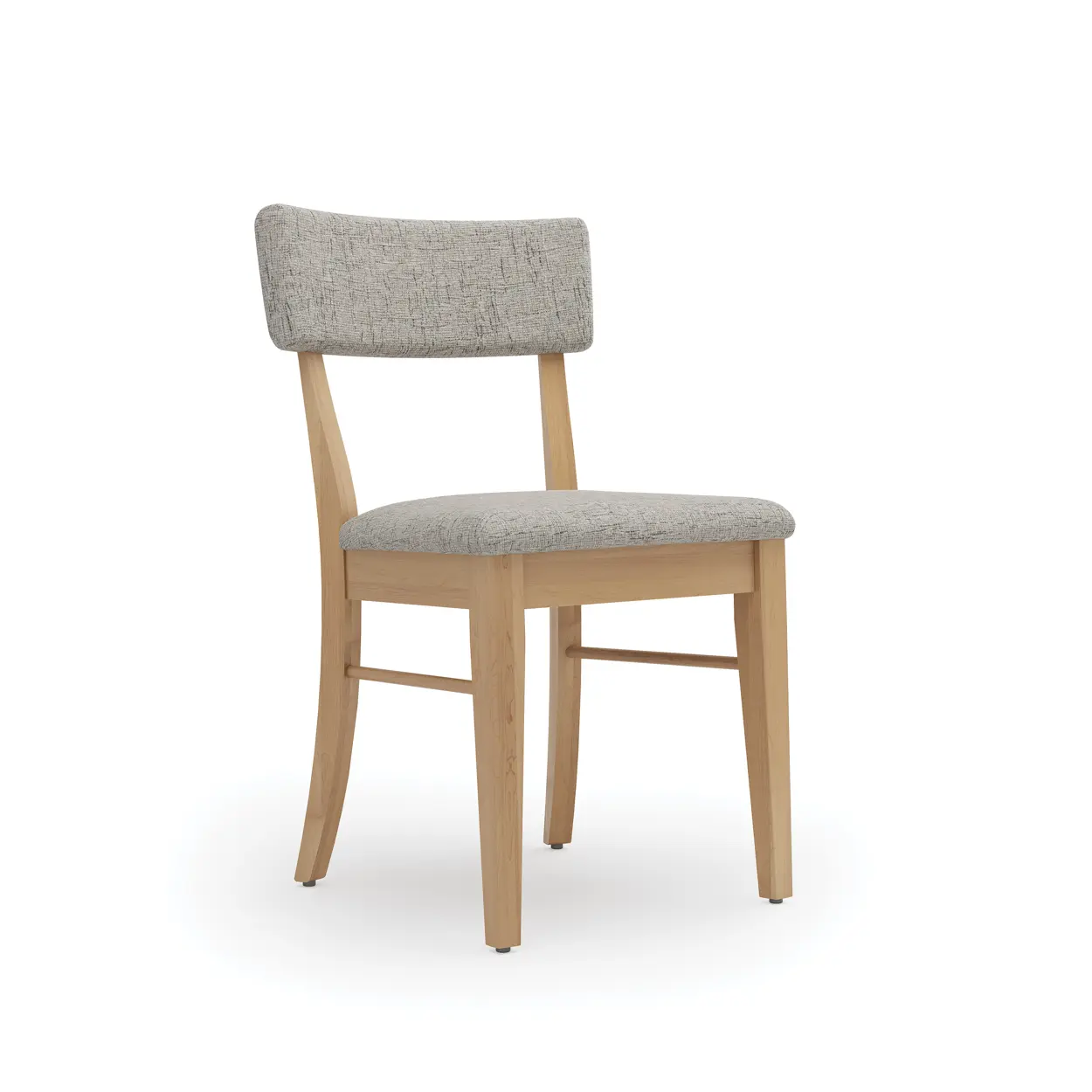 The Bella Side Chair pairs casual comfort with clean, contemporary design. Featuring a softly padded seat and backrest wrapped in textured upholstery, it invites you to linger a little longer at the table. Its light wood frame adds warmth and natural character, while the gently curved legs and angled backrest deliver subtle mid-century flair. Bella is an ideal choice for dining rooms that embrace both softness and style. Available in multiple wood species, finishes, and upholstery fabrics and leathers.