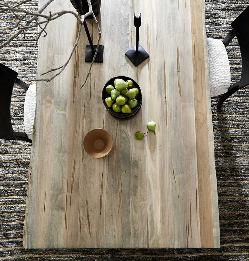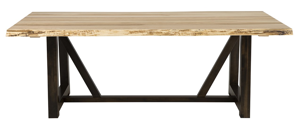 Find style and substance in this Mavin Live Edge table. Finished to retain the live edge of the wood, this table is a showstopper in any home. Shown here in 42″ x 84″ size with the Live Edge table in Maple, with a Winchester Double Base, and a two-tone finish: Natural on the table top, and Black Silk on the base. Please note that the Live Edge table only available in Maple, Wormy Maple, Rustic Oak and Rustic Cherry. Create the table that meets your stylistic and practical needs with flexible customization. Table tops and edges can be combined with a host of table legs and bases to showcase individual style. An array of wood species, stain, paint and finishing options complete every masterpiece.