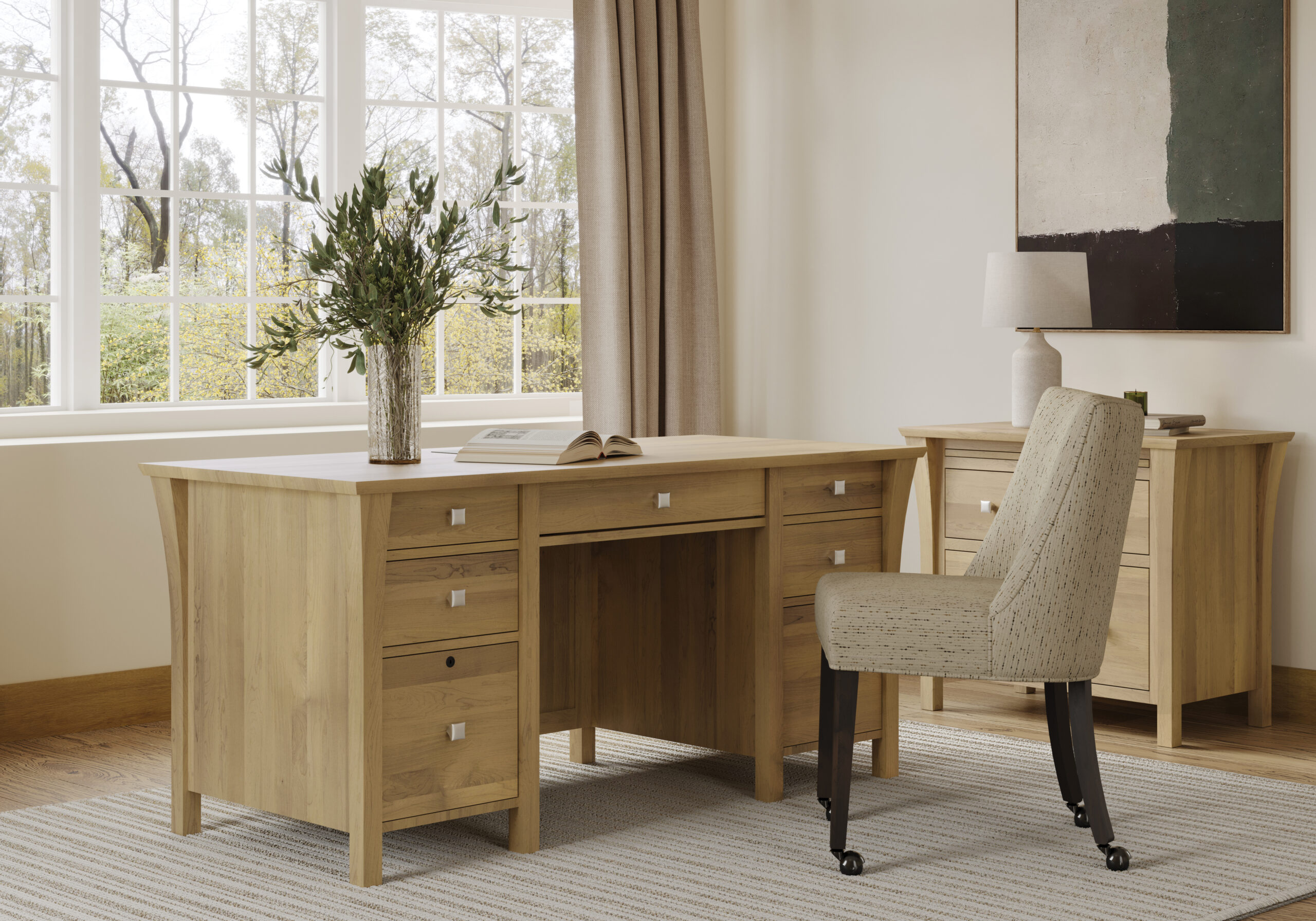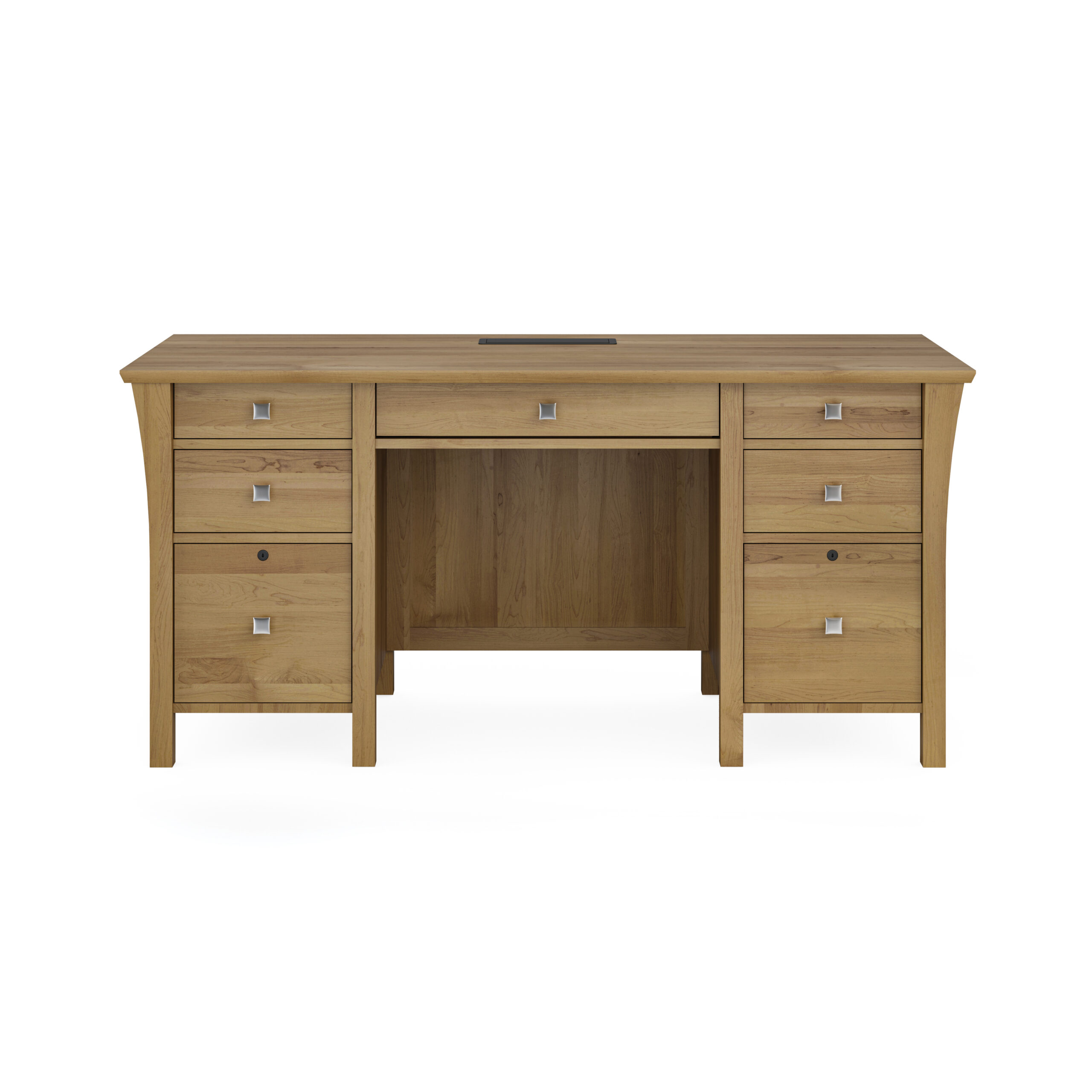 Chic and versatile, the Marco executive desk blends modern design with functionality, featuring silver hardware for a touch of elegance. To create your dream piece, choose from seven hardwood species, an array of stain, paint and finishing options, as well as a wide selection of hardware. Shown here in Honey Stain on Maple. Available in many coordinating pieces, each crafted by skilled artisans to exact specifications. Mavin furniture creates 100% American made fine furnishings, expertly from hardwood in Ohio’s Amish country.