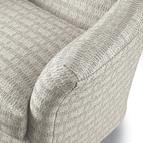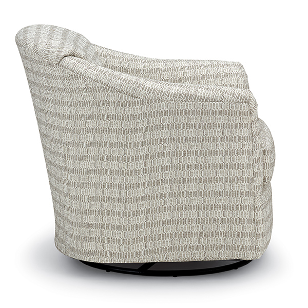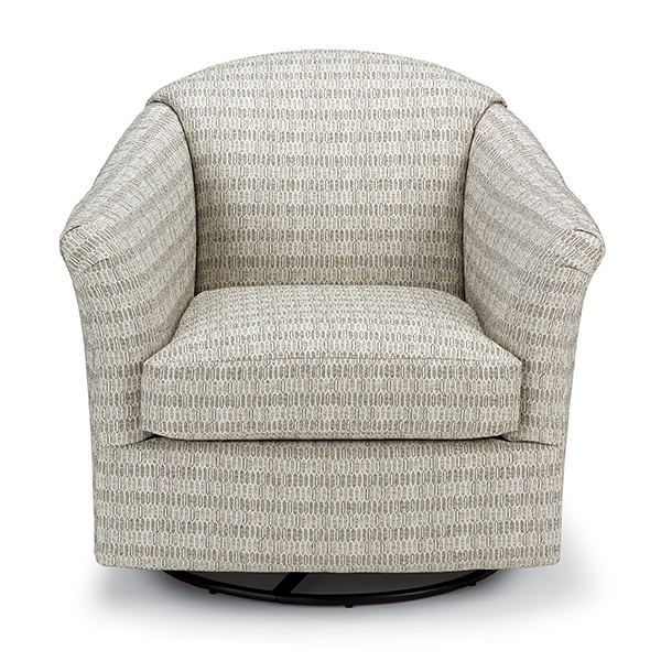 Effortlessly glide in this contemporary barrel chair. Available as a swivel chair or swivel glider, this unit has a reversible seat cushion and a slightly rounded arm with a smooth, pulled over back. The back is also slightly taller than most barrel chairs.